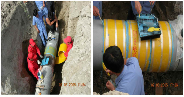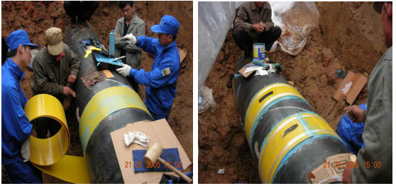 (管徑Ф508、Ф610,設(shè)計(jì)壓力6.9 Mpa。該項(xiàng)目從2005年6月開始,對(duì)位于新疆輪庫油線和氣線防腐層大修中發(fā)現(xiàn)的大于30%以上的腐蝕缺陷,使用MKT-8補(bǔ)強(qiáng)修復(fù)技術(shù)進(jìn)行修復(fù)。該管線穿越戈壁沙漠地區(qū),部分管段穿越鹽堿地區(qū)。充分展現(xiàn)了復(fù)合修復(fù)材料在戈壁沙漠地區(qū)的適應(yīng)性。)